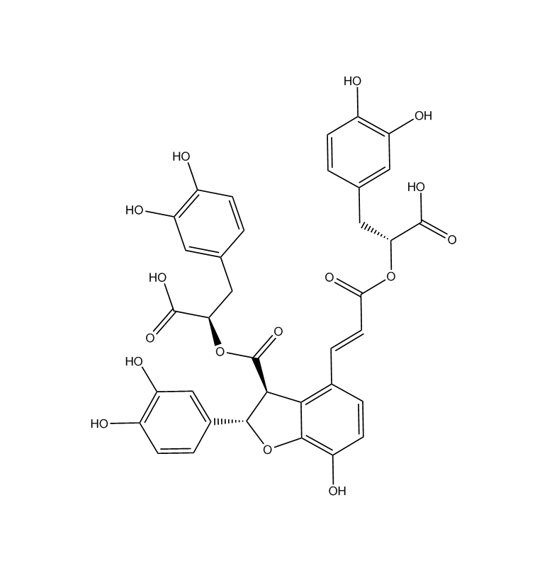 【英文別稱】 4-[2-[1-carboxy-2-(3,4-dihydroxy-phenyl)-ethoxycarbonyl]-vinyl]2-(3,4-dihydroxy-phenyl)-7-hydroxy-2,3-dihydro-benzofuran-3-carboxylic acid 1-carboxy-(3,4-dihydroxy-phenyl)-ethyl ester